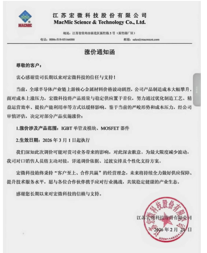 江苏宏微科技计划自2026年3月1日起,对IGBT单管及模块、MOSFET等核心功率半导体产品实施价格上调。