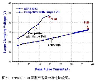 对于雷击浪涌,既要利用半导体制作的TVS进行全方位保护,又要将其集成到芯片之中一般很难实现。晶焱科技的RS-485收发器AZRS3082成功地将可抵挡雷击浪涌的特殊TVS内置到芯片之中,其传输线脉冲(TLP)双向特性曲线如图1所示。与其它内置雷击保护收发器的雷击浪涌测试特性比较如图2所示。由图可看出AZRS3082不仅可以承受更高的雷击浪涌电流,还具有更低的浪涌钳位电压。TVS浪涌钳位电压越低,那么它对芯片的保护效果也越好。