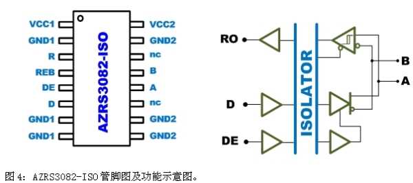 当系统设备置于高压环境中时,需要确保使用人员人身安全和对系统设备提供保护,以及在通信总线与逻辑控制器之间进行电气隔离。电气隔离不但可以使操作人员及系统设备免受危险电压威胁,还可以使系统在受到严重干扰和其它系统级噪声存在的情况下实现连续无差错的通信。AZRS485、AZRS3082以及AZRS3088都将RS485前端的保护器件集成到RS485收发器中以提供静电及雷击防护,而AZRS3082-ISO和AZRS3088还将RS485后端与逻辑控制器之间的电气隔离器件集成到RS-485收发器中,如图4所示。