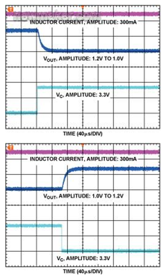 该方法产生了更加平滑的变换。不同于MOSFET开关方法,能够驱动电阻负载的任何控制电压均可用于该方案,而MOSFET开关方法仅能够用于驱动电容负载的控制信号源。该方法可以适用于任何输出电压组合和输出负载电流。因此,根据需要调整内核电压,便可以降低DSP的功耗。图5示出了使用该电流注入方法的两个输出电压之间的变换。