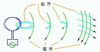 交流的场合,它的电界与磁界与直流完全相同,随着时间的经过,直流的电界与磁界呈正弦波形变化,此时若作某种程度远离发生源时,电界与磁界会自形整合,成为具备波动性质,整合电界与磁界之后获得的波称为「电磁波」,或是「电波」。
