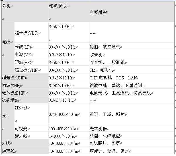 如表1所示电磁波除了电波之外还包含波长极短的紫外光、可视光、X线、伽玛线(Gamma),表中的电波是电波法定义的范围。通常电波以频率表示,光线则以波长表示居多,光速为3x108m/s,波长λ(m)与频率f(Hz)可以用下式换算: