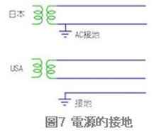如图7所示有关电子机器的接地,出现所谓的商用电源的接地,日本的商用电源采取单线(其中一线)接地;美国的AC电源本身未接地,设有其它接地线形成三线结构,不论是日本或是美国的接地,都是基于保全目的规类成筐体接地。日本的接地方式使用电源线之中一条线作接地,无法当作一般接地使用,这种接地方式称为「AC接地」。