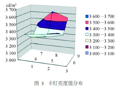 为直观对比各测试点的亮度大小,每个点取五个亮度平均值,制成三维曲面图如图3所示,其中水平面的横轴和纵轴表示测量点的位置,用点的数字标号标注,垂直的数值轴表示9个点的亮度平均值,单位为cd /m2。