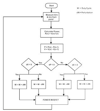 最常用的扰动观察法是最MPPT算法。在该方法中,连接MOSFET(隔开面板和电池)的PWM的占空比变化量很少,只有几dW。如果这少量变化增加了。面板电压和电流会测量到,相应的功率变化dP也会观察到。如果变化是正的,那么扰动是正确的方向,我们继续在相同的方向扰动(例如,增加占空比)。如果功率改变是负的,那么就要翻转颠倒扰乱方向(例如,减少占空比责任周期)然后继续工作。这种算法的主要目的是总是提升功率曲线,以达到从太阳能电池输出最大功率。通过这种方式,我们可以使太阳能电池板总是工作在提供最大功率的点上。