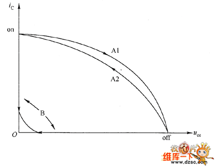由图1(a)可知,在ZCS谐振开关中,当开关管S1开通时,谐振网络LrCr接通,电路谐振,开关管中的电流按准正弦规律变化(因此称为准谐振),但谐振频率不一定等于开关频率。当电流谐振到零时,令开关管关断,谐振停止,故图1(a)称为ZCS谐振开关或准谐振开关。图1(c)给出了ZSC条件下开关管上的电压Uce和电流iC的波形,图2给出了PWM开关的电压、电流轨迹(A1为关断过程,A2为开通过程)和ZCS谐振开关的电压、电流轨迹B。