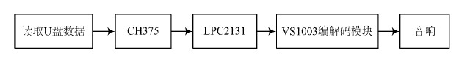 本文介绍一种基于ARM LPC2131 的新式MP3 播放器设计, 这种设计思路是以LPC2131 控制器为核心,来协同音频解码模块和音乐文件存取模块。这样可以克服现在市场上MP3 价格高昂和音质之间的矛盾, 并且具有海量存储的优点。总体设计方案如图1 所示, 是以ARM LPC2131 作为控制器来控制音频解码模块和音乐文件存取模块。