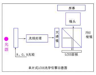 LCOS(Liquid Crystal On Silicon)技术结合了半导体与LCD技术,其光学成像原理与DLP同为反射方式。与前述两种背投技术相比,优势在于高解析度、高亮度的特性,而且结构简单,成本降低潜力大。虽然在目前的背投应用方面,相对于流行的LCD技术及近期热门DLP投影技术而言,LCOS仍不能与其抗衡,短期内在这三大技术中暂时屈居第三,但是LCOS仍是相当被看好的、最具潜力的投影技术,随着其光学投影系统在重量、亮度上的不断改善,必将在背投电视市场占据显赫地位。此外,就我国高端背投彩电切入点来说,要建立自己的技术优势,LCOS技术是目前的首选。由显示面板来看,在LCD技术领域日、韩占据着相当大的优势,我国台湾地区也只是占据了部分中、低端市场,DLP技术更是由TI独家控制着其核心器件DMD。而LCOS技术尚未成熟,此时开发LCOS,将有机会摆脱在LCD、DLP投影技术上受制于人的情况,因此可以说LCOS是我国在高端彩电技术上取得领头地位的机会。目前我国台湾地区厂商在LCOS技术开发方面相当积极,联电所主导的LCOS联盟已经比较引人注目。HDTV的推广应用,必将加快LCOS产业化进程。 LCOS显示面板其中一面以CMOS芯片为基板,无法让光线直接穿过,因此采用穿透式成像方式,因此其背投光学系统和LCD背投影机便产生了区别。通常LCOS光学系统中需要利用偏极化分光镜(Polarization Beam Splitter: PBS), 将入射LCOS面板的光线与反射的光线分开。PBS是由两个45度等腰直角棱镜底边粘合的而成的棱镜,当非线性偏极化光入射PBS时,PBS会反射入射光的S偏振光(垂直入射线平面),并且让P偏振光(平行入射线平面)通过。关于LCOS光学系统技术仍在起步阶段,所以IBM、ColorQuad、Philip、Hologram等多家厂商都开发了不同的LCOS光学引擎架构。但主要可分为单片式和三片式两大类,如下: