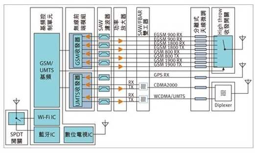 每一链路所对应的频段或多或少有一些不同的阻抗特性。如果每一链路都有独立的天线,整体链路便可以得到最佳化。然而,单独的天线既占空间、成本又高,而且具有显著的交叉藕合特性,因此,多条链路被迫以开关和滤波器结合成单一通道。