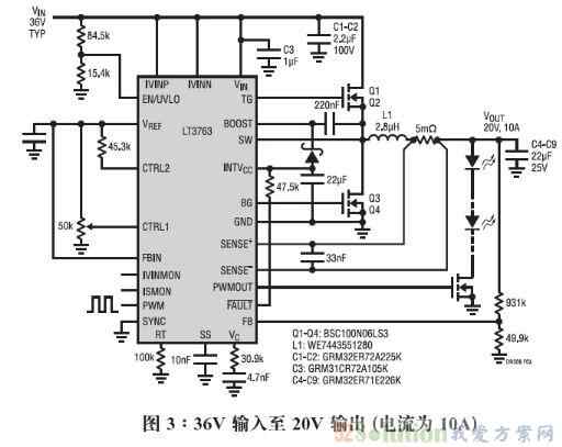 对于高功率、高性能照明应用来说,PWM LED 调光是标准的调光方法。在诸如 DLP 投影仪等图像生成应用中,针对 PWM 信号的快速 LED 电流响应是很重要。图 3 示出了 LT3763 在一种专为实现快速 LED PWM 调光而优化的应用电路。