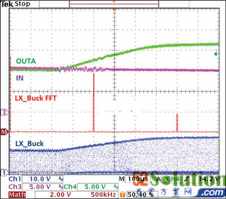 基于示波器的FFT分析工具,冷启动下MAX16952开关节点LX_BUCK引脚的电压频谱如曲线图4 (IN电压下降阶段)和曲线图5 (IN电压电压上升阶段)。注意到频谱中包括2MHz频率,相关谐波为直流分量。没有低于2MHz的交流分量,避免对AM频带产生干扰。