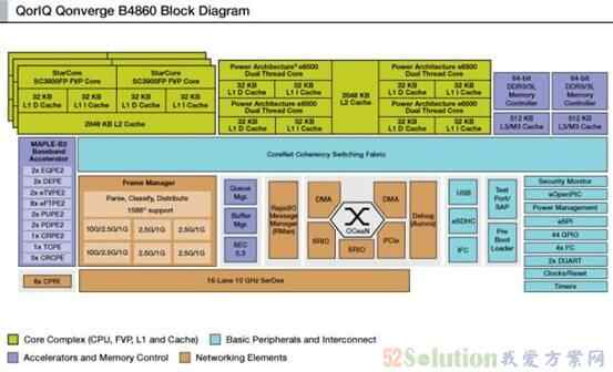 其中,B4860总体可编程处理性能高达14.4 GHz,集成四个e6500双线程Power Architecture处理器内核,实现61000处理器CoreMark。六个定点及浮点SC3900FP DSP内核可达到每秒2304亿次加乘运算(GMACS)的定点性能和每秒1152亿次浮点运算(GFLOPS)性能。配合嵌入e6500内核的四个AltiVec SIMD引擎,总计可达到每秒1728亿次浮点运算的IEEE 754浮点性能。功能强大的可编程内核与内置IP数据包处理和安全加速引擎的结合,提供了出色的灵活性和卓越的处理性能,并促进了需要高效节能系统具备大规模处理性能的应用开发。