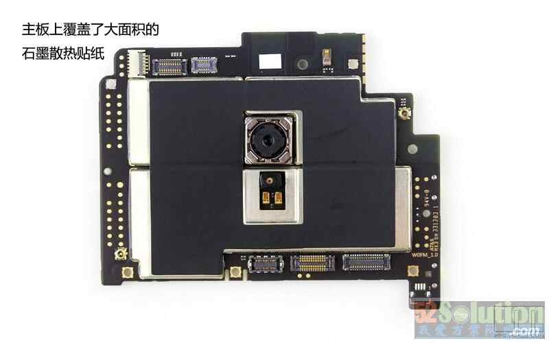 下面进入主板部分,主板正面覆盖了大面积的石墨散热贴纸,该部分还集成了主摄像头,可拆卸。不过贴纸下方的屏蔽罩焊死在了主板上,无法正常拆除。