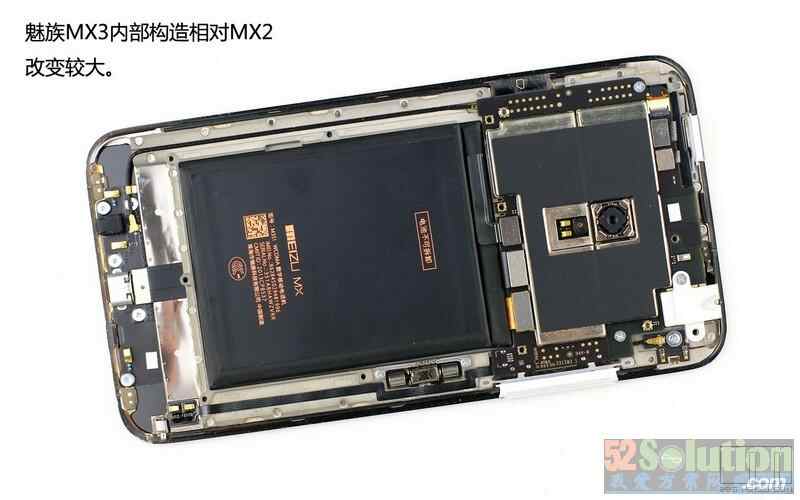 相对MX2,魅族MX3的内部构造要相对复杂些,从露出的排线就可以看出,另外整体也分为四大部分,主板、电池、小主板和液晶屏幕。