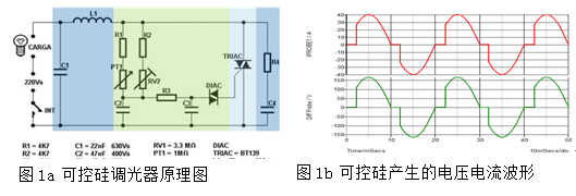 图1所示为典型的前沿可控硅调光器原理图,以及它所产生的电压和电流波形。回路电压/电流是同相位的(负载是白炽灯)。