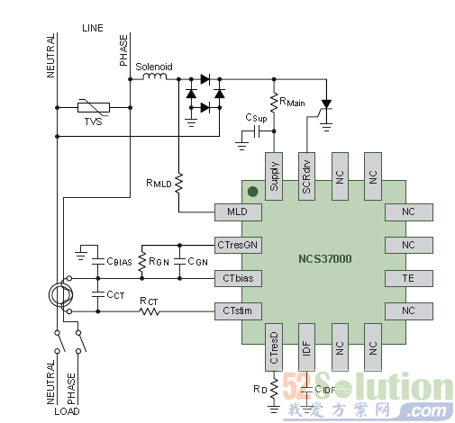 图8. 安森美半导体NCS37000 GFCI信号处理器应用示图