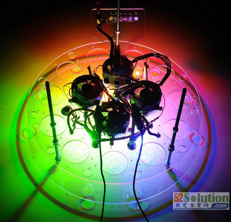 最初的设计,11个白色LED,3个彩色的,一共84000流明。每个灯珠的发光面积只有1.8cm x 1.8cm,粗略计算,只有10瓦被用来发光了,剩下的去散热出去了。
