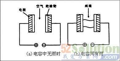 如图下图(a)所示为电容极板间无雨时情形,这时的极板间的填充物为空气,图(b) 所示为电容极板间有雨时的情形,此时极板间的填充物为雨滴,由于空气和雨滴的导电性能不一致,导致这两种情况下的介电系数发生变化,不同雨量的介电系数也不一样,因此电容的容量将发生变化。
