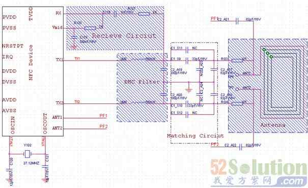 NFC 射频电路是由 EMC 滤波电路 ,匹配电路 ,接收电路 ,天线 四部分组成。