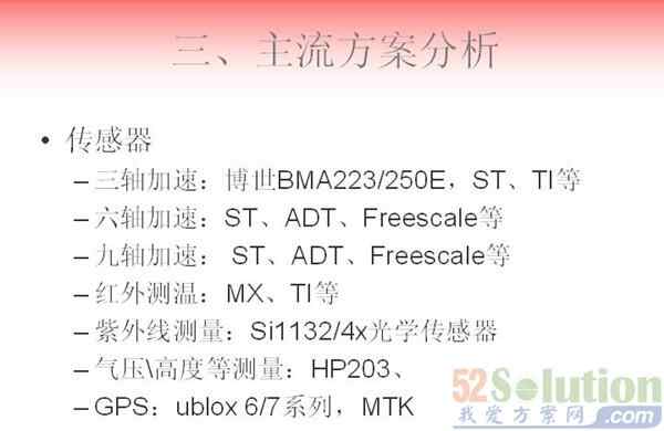 这是手表定位,解决方案做一些分析,现在从MCU来说,未来做手表有16位单片机,TIMSP430这些系列,还有用ARM3/9/A系列这是高性能的芯片,像台湾MTK、国内的展讯、君正包括其他纳米芯片都有,手机手表跟安卓手表基本上通用,这是一个系列。另外一种就是属于低功耗32位的纳米芯片,ARMCONTEXM0-3/4芯片,像FREESCALE、ST这些。