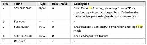 而当使能ARM Cortex-M微控制器上的Sleep-on-Exit功能后,MCU就会在中断处理完成后直接进入休眠状态,而不用先返回到原有线程上(见图4)。这会使处理器仍然保持在中断状态,因为消除了唤醒再入栈过程,因而节省下许多宝贵的机器周期。消除入栈出栈过程既节省了时间也节省了能耗,否则电能就会被不必要的指令周期白白消耗,也包括哪些传统MCU在休眠和唤醒之间管理堆栈的代码。而且,当处理器被中止调试请求(Halt Debug Request)唤醒时,出栈过程将会自动进行。