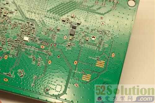 整个主板干净整洁,非常平整,走线看着也比较舒服。露铜的部分金光灿灿的,而且应该是有设计过的,属于沉金板工艺,也就是原材料里面有一定比例的黄金,现在很多路由产品使用的都是OSP工艺的电路板。而沉金板在抗腐蚀性、可焊接性、散热性、电气连接性方面都比OSP板有显著的提升!