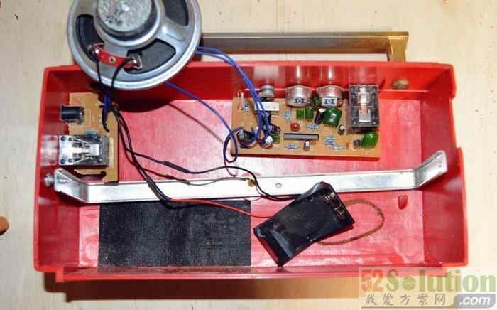 剪断放大器电池盒电线,将电池支架焊接固定,要注意极性。然后在支架底部绕一些尼龙搭扣连接至收音机内部。