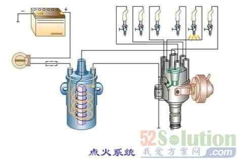 在汽油机中,气缸内的可燃混合气是靠电火花点燃的,为此在汽油机的气缸盖上装有火花塞,火花塞头部伸入燃烧室内。能够按时在火花塞电极间产生电火花的全部设备称为点火系,点火系通常由蓄电池、发电机、分电器、点火线圈和火花塞等组成。
