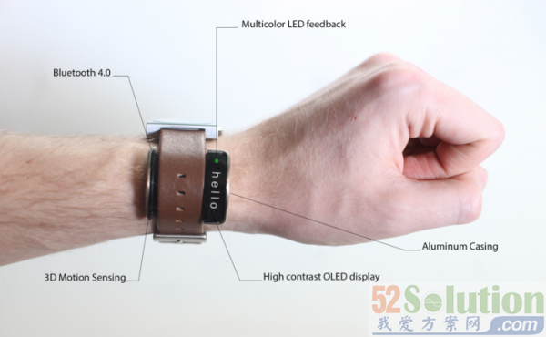 这个弯曲的设备Glance作为手表的附件,造型贴合手腕,中间的凹槽可以嵌入表带之下,上面有曲面的OLED屏幕,可以显示信息。通过蓝牙与用户的移动设备配对,配对之后可以通过振动和屏幕显示来电联系人,通过阅读器阅读短信息,用户还可以通过手势等回绝来电,回复预设信息,控制智能电视或电脑等。