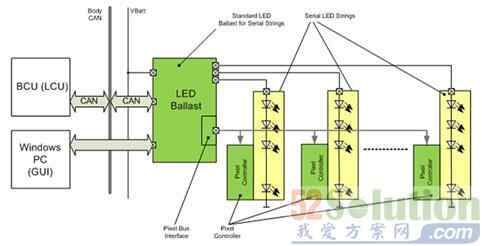 这样的矩阵式动态智能全LED前照灯可以采用串联或并联驱动结构。采用并联结构时,各颗LED在电气特性方面的差异对照明系统的性能有显著影响,造成能耗增加及散热问题。串联驱动结构中,LED驱动器提供恒流源,短路开关可以关闭单个LED,从而能够根据需要来改变光束。如果在串联驱动电路中增加伴侣芯片(像素控制器),透过系统划分,这样就有可能避免并联拓扑结构所固有的能耗及热管理问题。