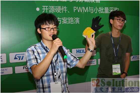 在五指琴的基础上我们又开发出来了智能手套,它能识别五个手指的运动,通过识别五个手指的运动识别你的意图,从而演奏出音乐。在以后我们会进一步把它升级成一个,比如说用于一些失语者他们不能通过说话,我们通过手指的运动合成语音,也就说失语者可以通过手指的运动来说话,在一些公共场合不太方便说话的地方,你要跟你的朋友聊天,你也可以通过手指的运动通过语音合成跟你的同伴进行交流,这就是我们智能手套未来的方向,它还可以操作一些智能的终端和玩一些游戏。这个就是我们智能手套的一个样品,但由于这边可能不太好演示,准备的时间可能会比较长,这个就是我们的五指琴,我们刚刚设计出来的一个五指琴。