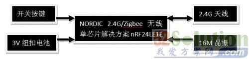 随心开关体积小巧,用单芯片的ZigBee解决方案似乎更为合理?但是即使用nRF24L01+RFX2401C的解决方案,在Noval灯上已经证明了其可以做得足够小,那为何不用在随心开关上?或者说为什么Noval灯和TelePort网关为何不用Nordic ZigBee的单芯片解决方案?依照笔者的推测,主要两方面原因,第一,随心开关的纽扣电池供电不适合nRF24L01+RFX2401C的解决方案,而至于Noval灯和TelePort网关则使用带有外部PA发射功率更强、信号通信范围更广的nRF24L01+RFX2401C的组合更为理想,最后在来看下随心开关的简单原理框图。
