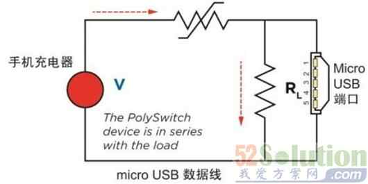 在使用中需要注意的是,要把PolySwitch产品放置到microUSB数据线一侧,才能对端口发生的故障实现有效的保护。如果把PolySwitch放置到智能手机内部,也就是手机的电源输入端处,虽然这个方式可以对手机内部的短路和过流实现有效的保护,但是对于在microUSB端口发生的故障不能实现有效地保护,因为由于端口处异物的存在,在microUSB端口就形成了一个低阻回路,手机充电器的电流可以经由microUSB端口的低阻回路回到充电器电路中,也就是电流不会再流到手机内部。图2是智能手机microUSB端口保护简图。电路保护的一个原则就是保护元件一定要放在被保护电路的上游处,这样才能对下游的电子器件实现有效地保护。对于这种故障原因,PolySwitch一定要放在故障点即端口之前才能有效地实现保护,所以PolySwitch产品放在microUSB数据线内部是一种切实可行的方案。