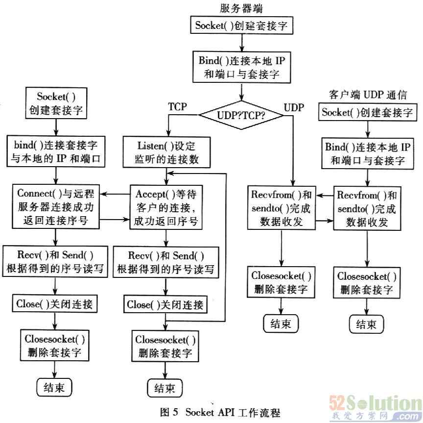 远程监控与远程控制的软件设计采用客户端一服务器方式。TCP/IP协议的传输层有两个数据传输协议:传输控制协议TCP和用户数据报传输协议UDP,二者各有特点。UDP协议是提供最少服务和费用的协议,它不基于连接来传输数据,因此UDP的传送数据是不可靠的。TCP协议是基于连接的双向传输的可靠数据传输协议,但是TCP协议的使用费用较高。在智能终端的设计中,充分考虑了数据传输的便利性和可靠性,并且鉴于ARM系统能够提供足够的资源,根据数据的不同要求,采用了不同的传输层协议。在软件设计中使用Socket API函数来编写UDP和TCP通信任务。TCP和UDP通信时,Socket API的应用流程如图5所示。