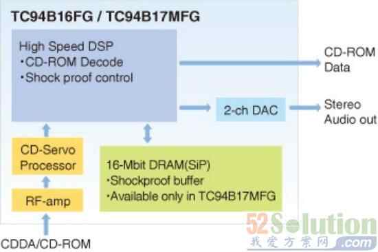TC94B16FG和TC94B17MFG是用于CD系统的单芯片处理器,内含射频放大器及数字伺服处理器。TC94B17MFG利用系统级封装 (SiP)内嵌了一个16MBit DRAM,以提供汽车音响应用所需要的防震功能,同时保持了与TC94B16FG的I.C脚位兼容性。无论是否带有防震功能,均可以使用相同的PCB来制造CD/MP3播放器。