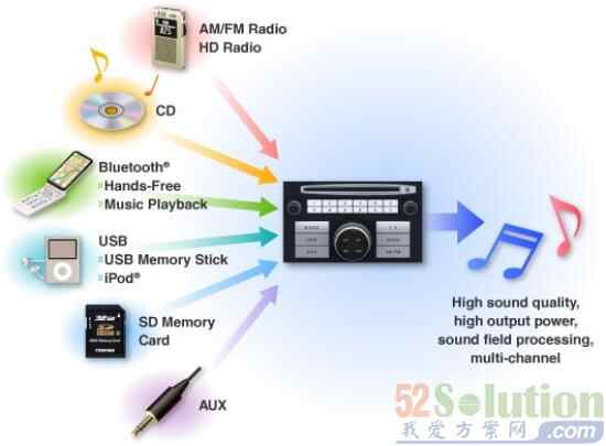 东芝公司通过不断发展全面的系统方案,包括音频处理, TransferJet, Bluetooth等无线传输的丰富经验和专门技术,提供了一整套车载娱乐系统解决方案。