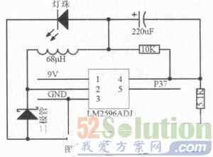 因为金属氧化物半导体材料在光激发下性能有很大的提高,且工作温度也大幅降低,所以我们设计了通过单片机控制LED灯珠光激发部分,其原理图如图5所示。我们采用可调稳压开关芯片LM2596ADJ作为光激发控制的核心,根据需求的不同可通过它的引脚4的两个电阻调整输出电压值,本实验控制在3.6V左右。单片机的一个I/O与引脚5相连,当引脚5为低电平“0”时稳压开关芯片输出3.6V,灯珠发光对材料进行光激发,当输出高电平“1”时芯片输出0V,停止光激发。我们采用紫外灯珠,波长在365~370nm,功耗1W.