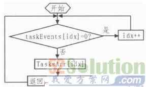 操作系统运行流程如图3所示。主函数在完成宜居通终端相关的初始化之后会进人操作系统,操作系统是一个无限循环,一直在检测各个任务中的事件tasksEvents[idx],当它不为零时就会调用相应的事件处理函数tasksArr[idx].处理完一个事件会将代表此事件的位清零,同时返回未处理的事件,直到这个任务中所有的事件处理完毕(即所有的事件位都被清零),操作系统就会跳向下一个任务进行事件处理。