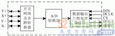 触摸屏控制器有多种,主要的功能均是在微处理器的控制下向触摸屏的两个方向分时施加电压,并将相应的电压信号传送给自身A/D转换器,在微处理器SPI口提供的同步时钟作用下将数字信号读入微处理器。控制器ADS7846基本结构如图2所示。