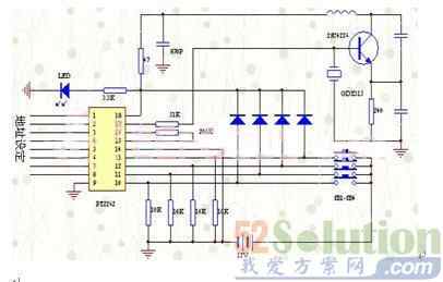 接收电路由PT2272实现解码,在使用中,采用8位地址码和4为数据码,为保证PT2262和PT2272配对使用,必须为其设置相同的地址码。另外,为方便起见,我们将PT2262和PT2272的8位地址编码端全部悬空,因此只要将二者的1~8脚设置相同就能随意改变地址编码。电路如图所示: