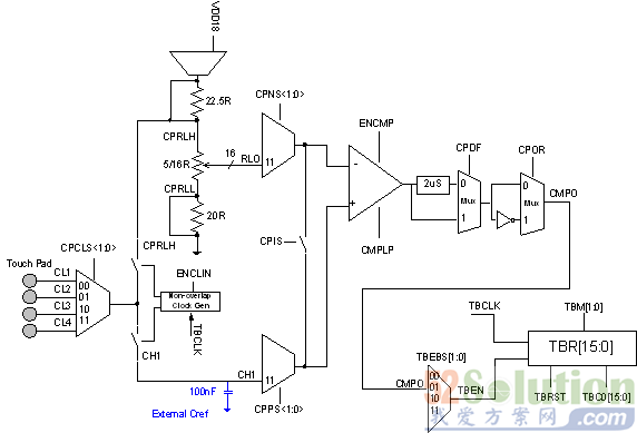 如上图 所示,TOUCH KEY 外围电路连接简单,只需再CMP的正输入端CH1端接入一个参考电容Cref=10nf;CMP的正输入端配置为CH1,与touch key pad的CH1端连接;负输入端配置为RLC,与NON-OVERLAP 的输出端RLO连接;NON-OVERLAP的电压源选择VDD18=1.8v,且CPRLS=1短路22.5R与20R电阻,设置NON-OVERLAP分压输出为1/16R;启动TMB且计数源为CMPO。透过设置CPIS=1,令CMP的输入端短路,将CH1上的Cref电容上的电量通过RLO接到VSS,进行完全放电;启动比较器及TMB开始计数,启动NON-OVERLAP,让VDD对touch pad 充电,由于NON-OVERLAP的开关功能,touch PAD对CH1 Cref充电,使得CH1端电压慢慢上升,当CH1端电压上升到RLO电位时,比较器输出转态CMPO=0,产生CMP中断标志位,停止TMB计数并记录TMBR计数值,与设定的TOUCH KEY计数临界值比较,若小于临界值,表示有触摸Touch Pad,反则,没有触摸Touch Pad。分别对不同的touch pad扫描。