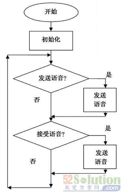 1.系统上电,打开系统;2.进行初始化。对8051的定时器time2、PWM输出端口、ADC转换器、RADIO、SPI接口和无线收发模块nRF2401进行初始化;3.判断是否要发送语音信号,如果有则发送,然后进入步骤4;4.如果没有语音发送,则判断是否要接收语音信号。如果有,则接收,然后进行步骤3;5.如果没有语音接收,则重新进行步骤3。