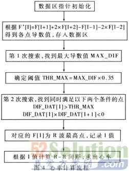 下面简要介绍一下心率计算模块的算法。设dR-R是相邻两个R波的间距(即两个R波之间有dR-R个采样点),由于心电通道的采样率为250Hz,所以250÷dR-R即为一秒钟内R波的个数,60×250÷dR-R即为一分钟内的心跳次数。因此关键在于对R波进行准确定位。算法流程如图4所示。其中F I 为数据RAM中最新的1024个心电信号值,一次运算后, FIFO即被刷新,准备进行下次运算。 图5显示了R波的定位结果,"X"标识出查找到的R波最高点。