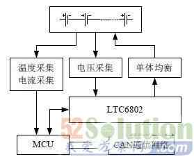 电池组监控平台的整体结构如图1 所示。本平台设计采用分布式CAN 总线结构,首先,LTC6802用于实现对单体电压的采集以及串联电池组的被动均衡控制;主控芯片负责接收来自LTC6802 的电压采集信息,并对LTC6802 的相关参数进行设置,此外MCU 还用于实现电池包节点温度以及电流的采集;最后MCU 将电池包的组态信息发送到CAN 通信网络。