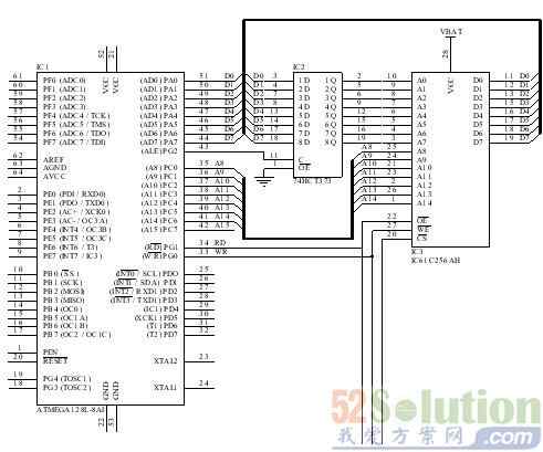 SOE事件记录存储器使用32k低功耗SRAM(IC3)IC61C256AH和后备电源形成一个断电不丢失的数据存储单元,使用数据锁存器74HC373(IC2)和CPU的PC端口组成15位数据地址对IC3进行数据存储操作(见图4)。