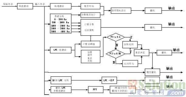 输入的原始语音信号经过隔直滤波(即高通滤波),得到目标信号S(n)。再对目标信号作以下处理:①低通滤波后用归一化互相关法进行基音粗估,然后根据[0Hz,500Hz]子带信号围绕粗估基音估算分数基音;②带通分析,在5个子带计算话音强度,以决定各子带的清/浊音判决,其中[0Hz,500Hz]子带强度用于确定非周期标志位;③计算LPC和尖峰值,用L-D算法提取10个LP系数,然后乘以带宽扩展系数,使用得到的系数计算残差信号,对残差信号的160个抽样计算尖峰值;④使用截止频率为1kHz的6阶巴特沃兹滤波器低通滤波残差信号,结合上一子帧的基音和当前子帧的分数基因,搜索出最终基音周期;⑤使用一个基音自适应窗采用一帧两次的方法对增益进行量化;⑥LPC分析,并转换成线谱对LSP参数量化;⑦将量化后的LSP参数转换为LPC参数并进行逆滤波操作,残差信号补0至512点,对其进行512点FFT,利用频谱峰点检测算法找到前10次谐波对应的傅立叶系数输出。