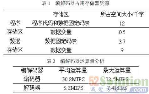 从表1可见,程序和数据存储区总存储量共25.2K字,由于TMS320VC5416内部RAM的大小为128K字,因此,程序boot时,可以一次将所有程序和数据直接搬移到芯片内部RAM里运行。表2显示了对该声码器所用资源的统计结果。在全双工时,最大运算量为39.9MIPS,完成满足实时实现的要求。