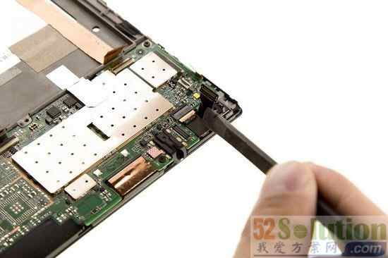 接下来为了保证拆解安全,所以需要先分离电池连接排线,但由于在电池下面压着三个排线,所以我们 将两个采用ZIF连接器的排线分离。