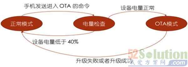 升级模式下,手环等待手机端把要升级的ROM通过蓝牙发过来,然后进行升级。空中升级模式(Over--‐the--‐Air)给手环的bug修复、产品优化提供了实现的途径,这也是智能设备必备的功能。