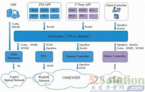 ●单域控制器层与Optical Network设备层之间的南向接口(South Bound Interface,SBI)尽量兼容WASON(自动交换光网络)及较早部署的OTN网络,确保SDON网络与这些网络设备的互联互通,更好地适应运营商对业务部署的平滑升级、渐进式演进思路。